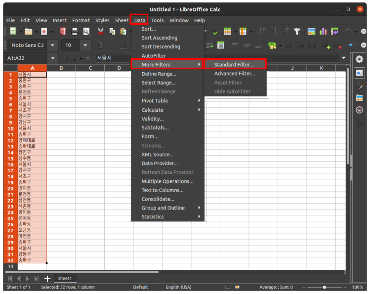 2. 상단 메뉴에서 'Data > More Filters > Standard Filter...' 선택