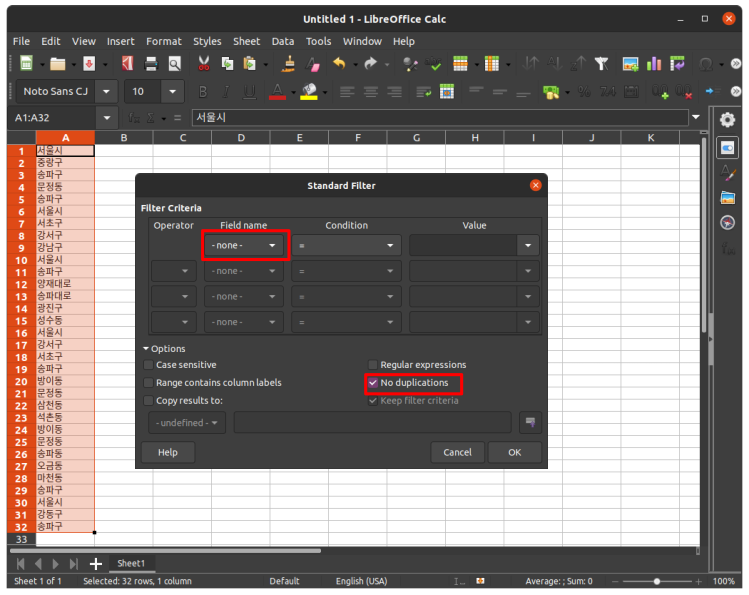 3. 필드 이름을 '-none-'으로 변경, 하단 'Options > No duplications' 체크 후 확인