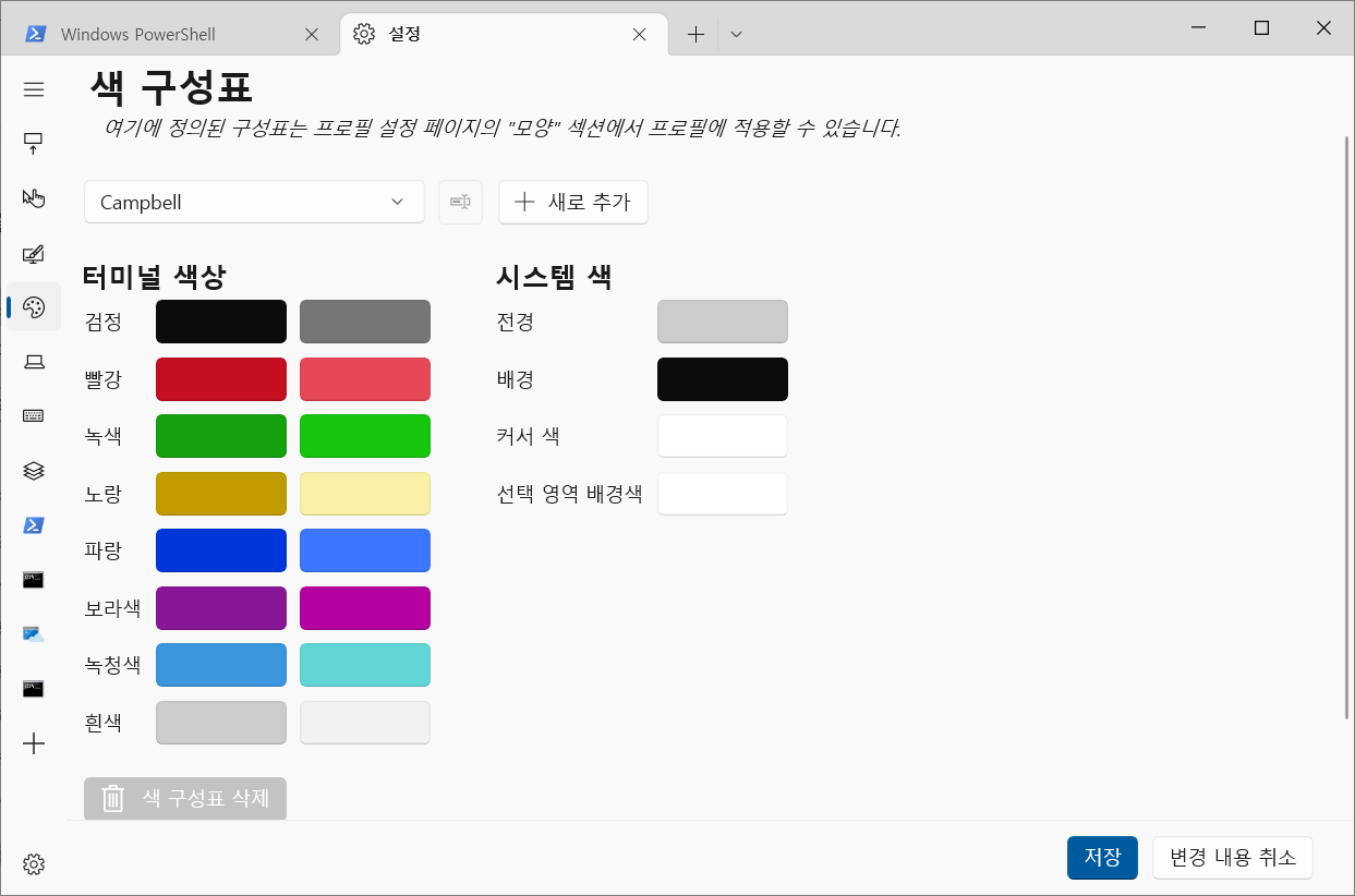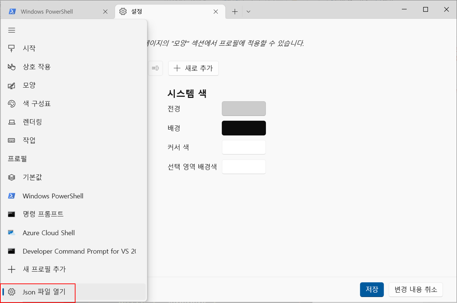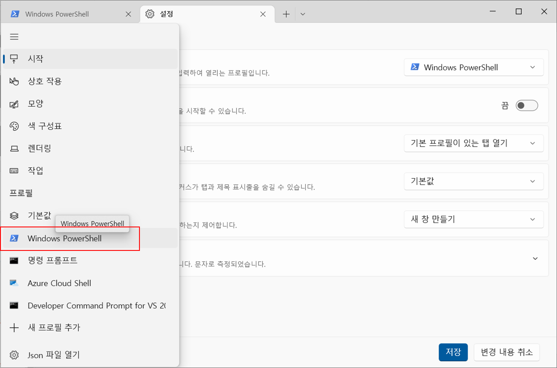 "설정" > "Windows PowerShell"을 선택해 프로필 설정 메뉴로 진입한다.