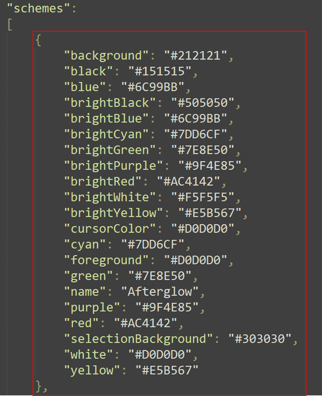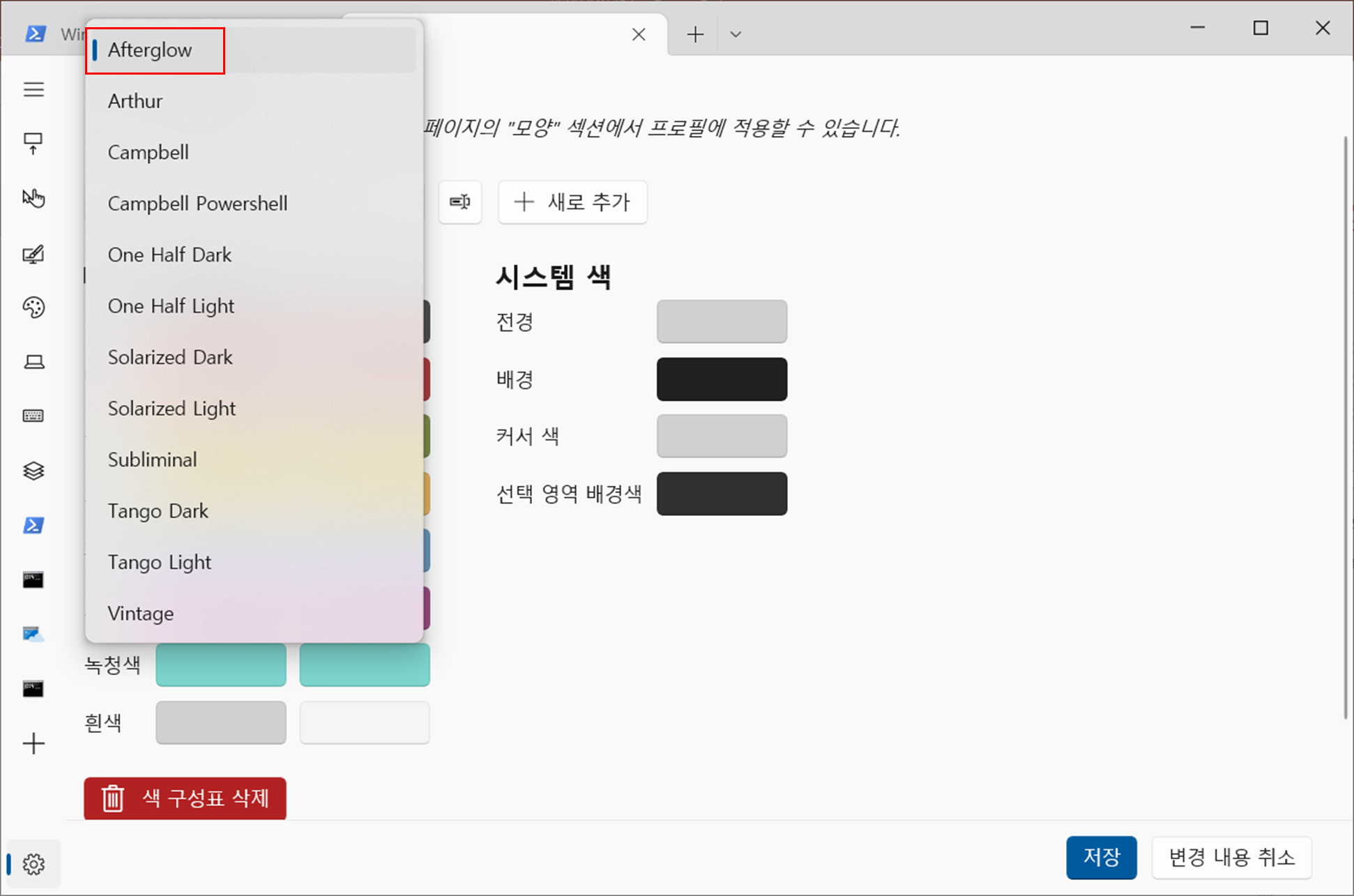 예를 들어, 위 링크 중 Windows Terminal Themes에서 다음과 같이 Afterglow라는 테마를 가져다 설정해 보겠다.