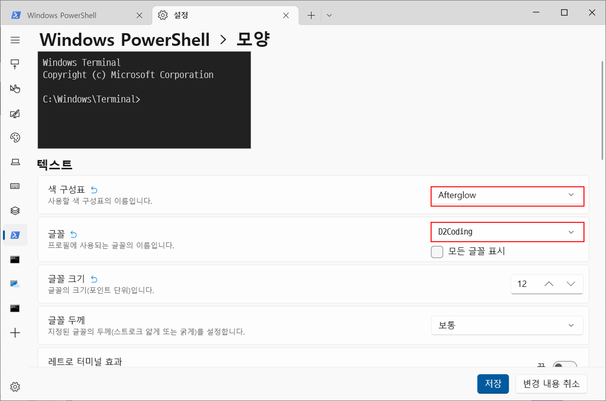이는 위에서처럼 Global하게 테마를 추가한 것과는 다르게 각 프로필(Windows PowerShell, 명령 프롬프트 등)에서 개별 설정해야 한다. 마찬가지로, 테마도 위에서 설치한 것은 사용할 수 있는 테마를 Global하게 추가만 했을 뿐 아직 각 프로필별로 설정하진 않은 상태이니 여기서 폰트와 테마를 설정해보자.