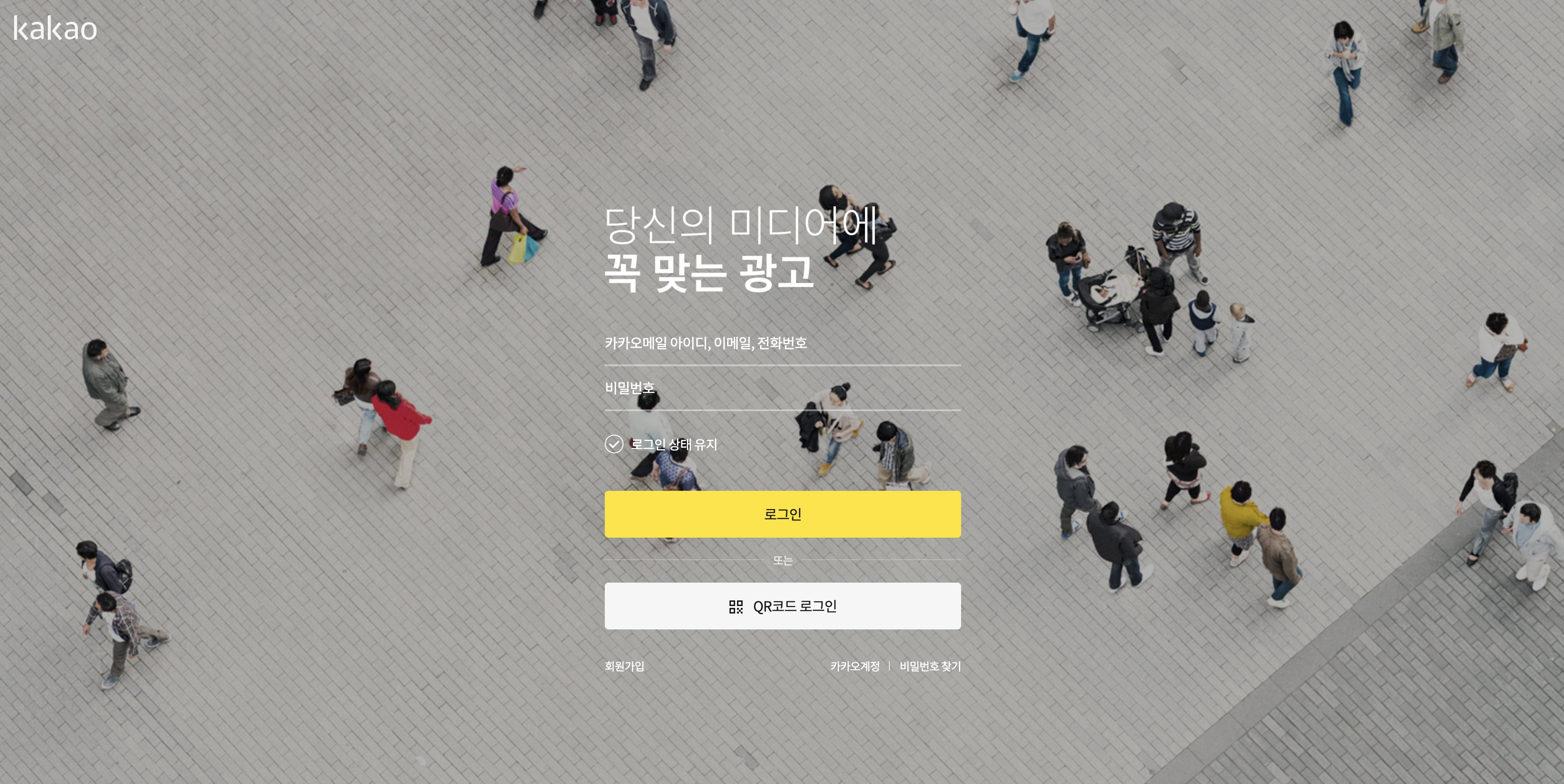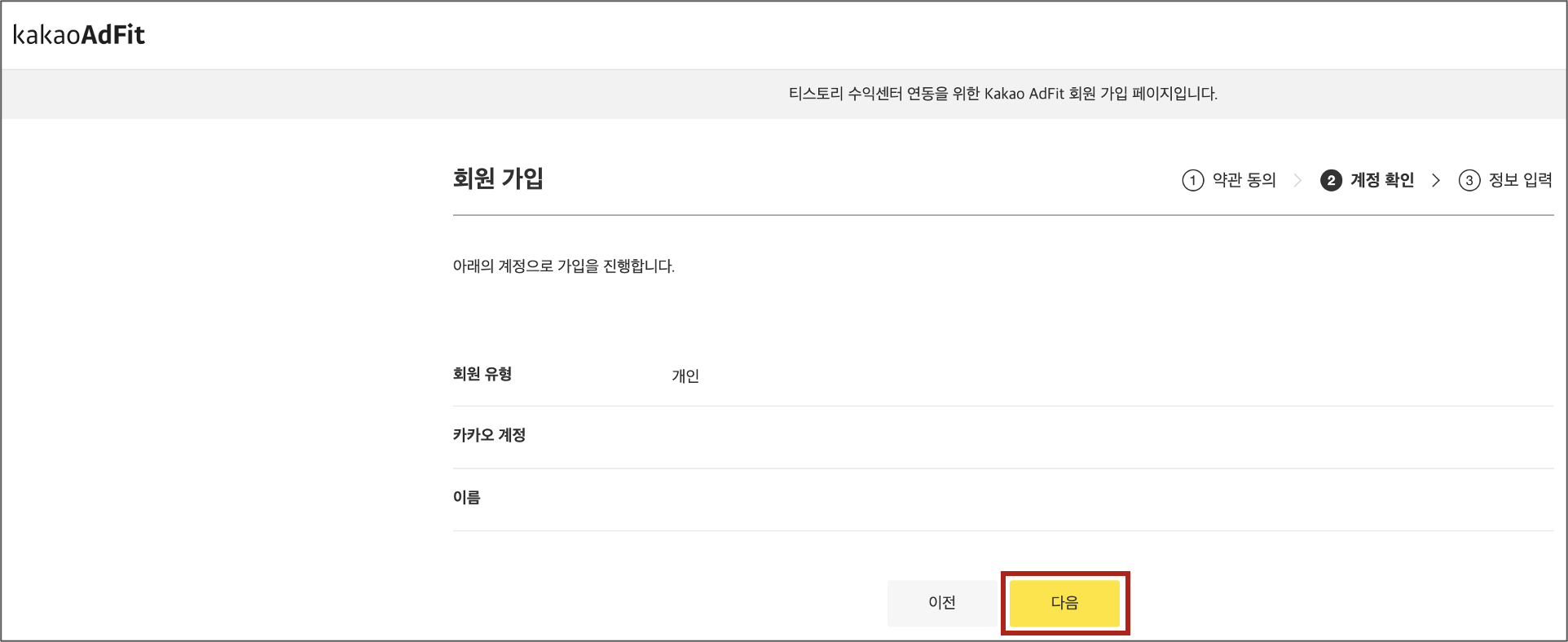 카카오 계정을 갖고 있지 않다면 먼저 카카오 계정을 만들어야 하고, 갖고 있다면 로그인 후 바로 카카오애드핏(kakaoAdFit) 회원가입 절차를 진행하게 된다. (여기서는 카카오 계정을 만드는 과정은 따로 설명하지 않는다)