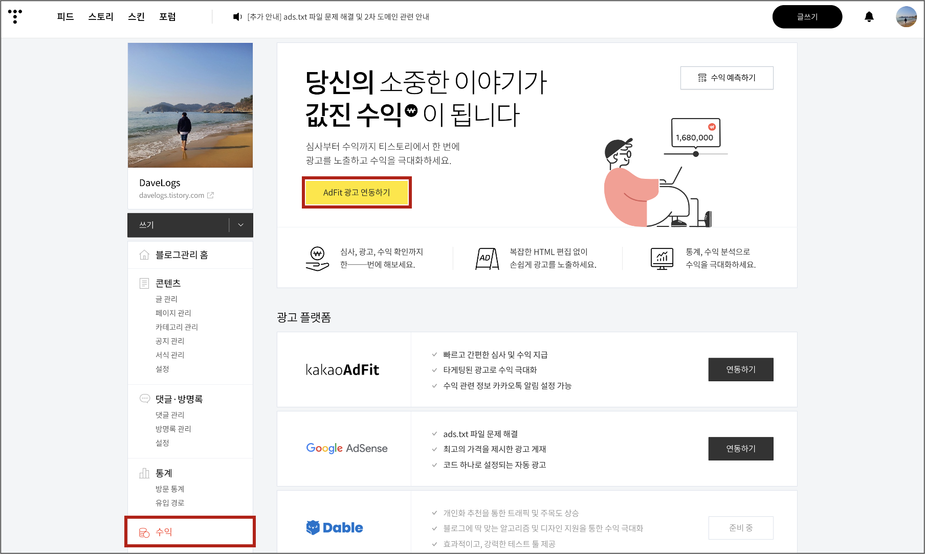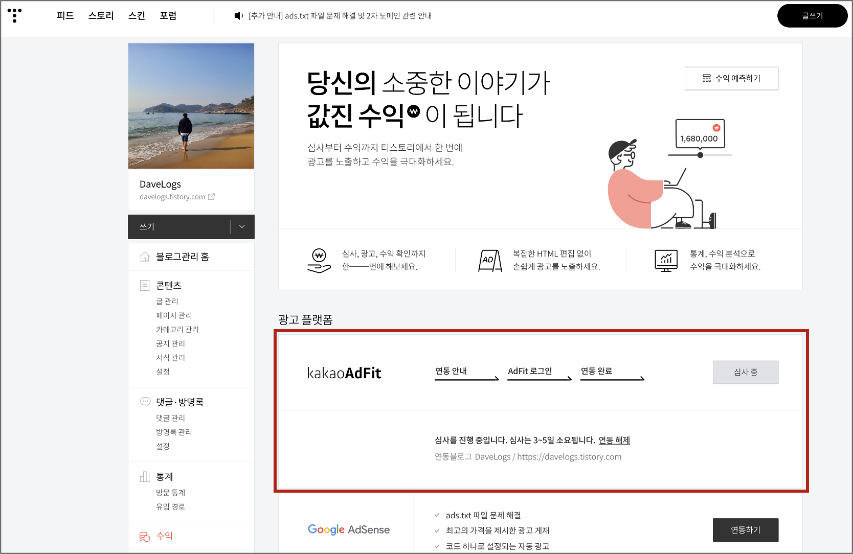 위 조건을 만족하면 '블로그관리 > 수익' 에서 다음과 같은 화면을 확인할 수 있다.