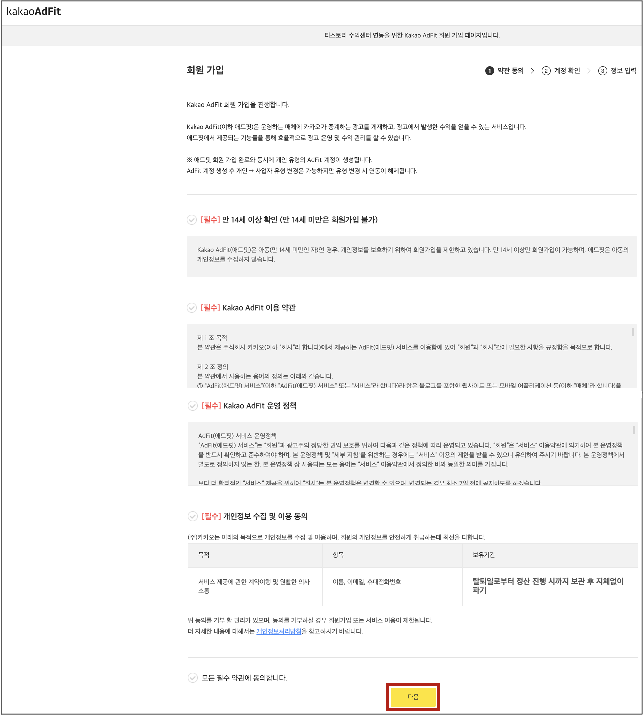 모든 필수 약관에 동의 후 다음 절차로 넘어간다.