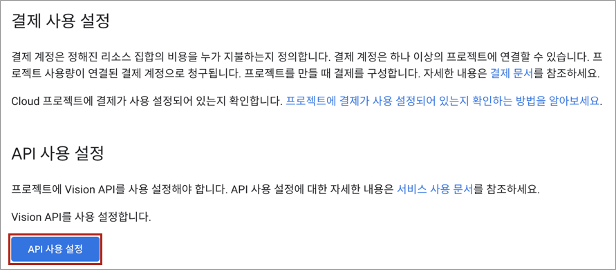 결제 사용 설정은 이미 'Google Cloud 시작하기' 단계에서 진행했다. 바로 API 사용 설정으로 넘어간다.