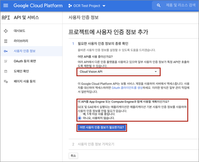 위 단계에서 '사용자 인증 정보로 이동' 버튼을 누르면 아래 단계를 이어서 진행할 수 있다.