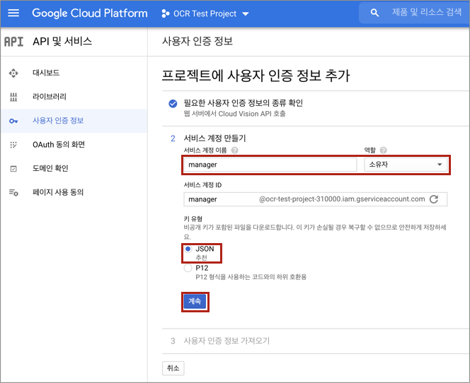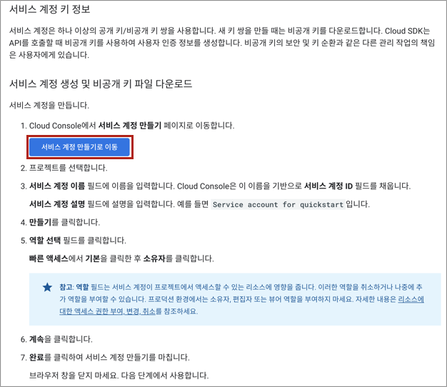 2.3 서비스 계정 생성 및 비공개 키 파일 다운로드