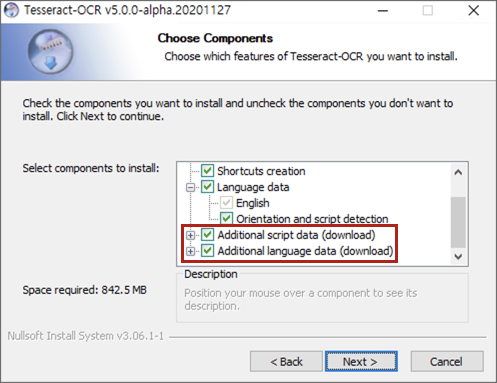 한국어 언어팩도 같이 설치하기 위해 'Additional script data', 'Additional language data' 를 체크한다. (아... 한국어 데이터만 선택해서 설치할 걸 그랬다. 언어팩 다운로드 및 설치 시간이 생각보다 꽤 걸린다)