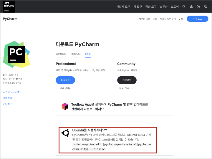 https://www.jetbrains.com/ko-kr/pycharm/download/#section=linux