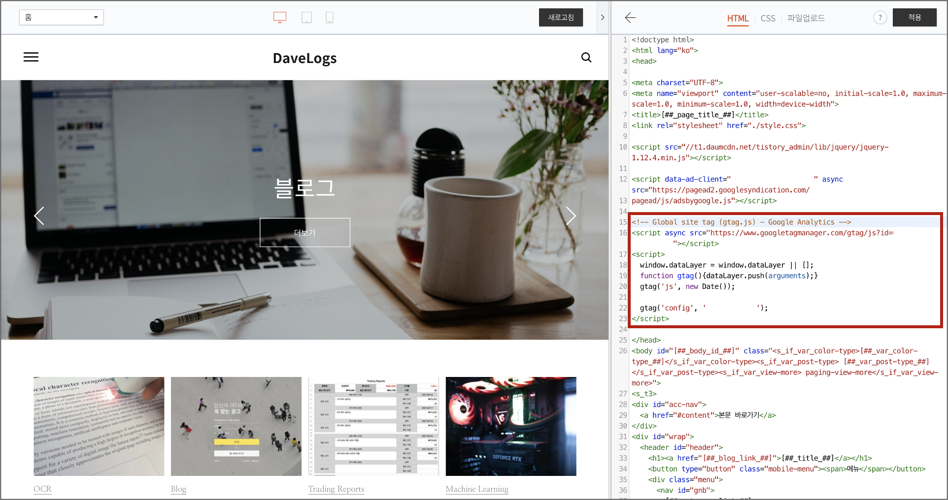이제 티스토리 블로그 관리 페이지로 와서 '블로그 관리 > 꾸미기 > 스킨편집' 으로 이동 후 우측 상단의 'html 편집' 을 누르면 다음과 같은 화면을 볼 수 있다.
