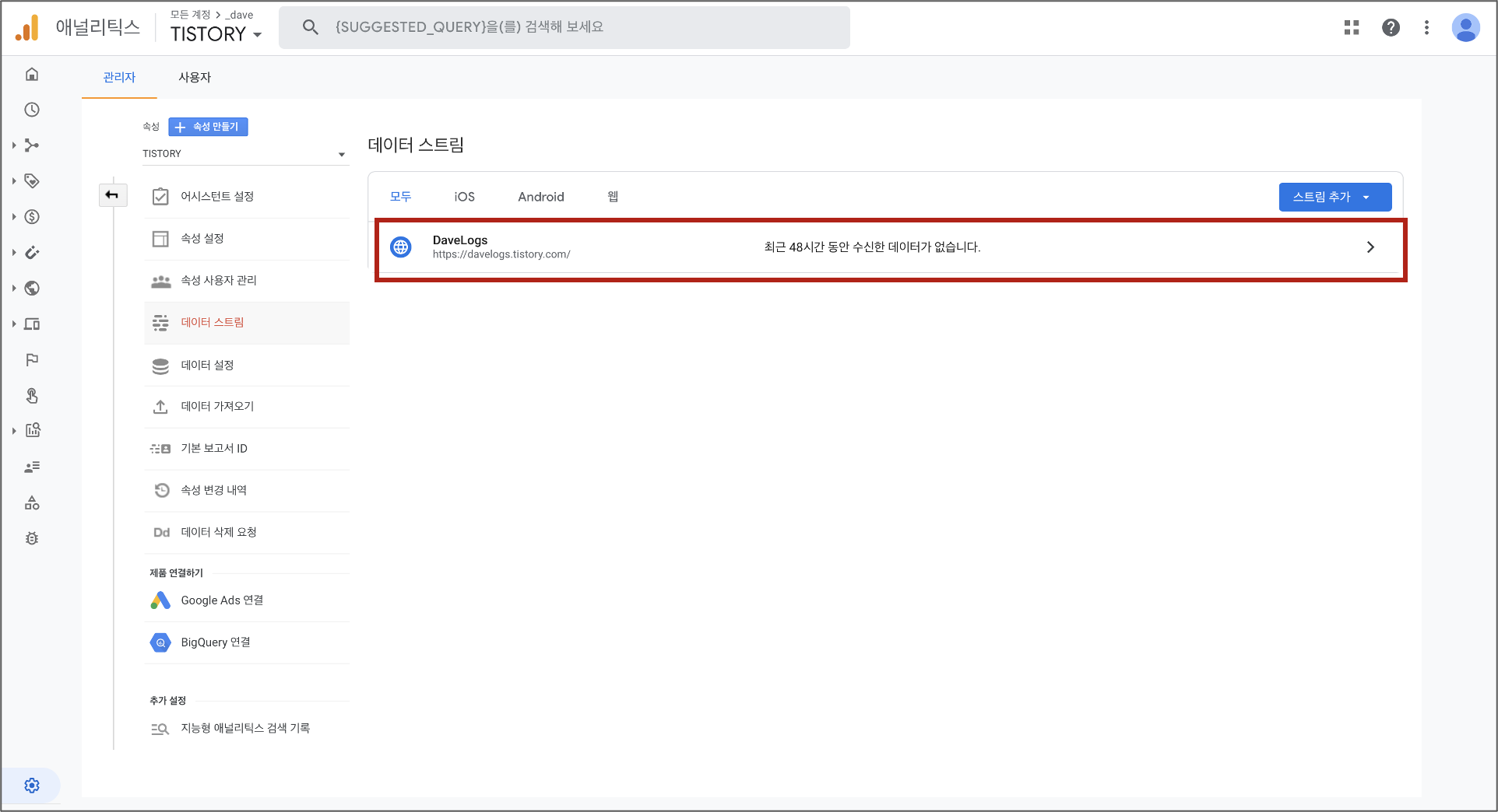이어서 '웹사이트 URL'과 '스트림 이름'을 입력하고 '스트림 만들기'를 누른다. (스트림 이름은 그냥 블로그명을 넣었다)