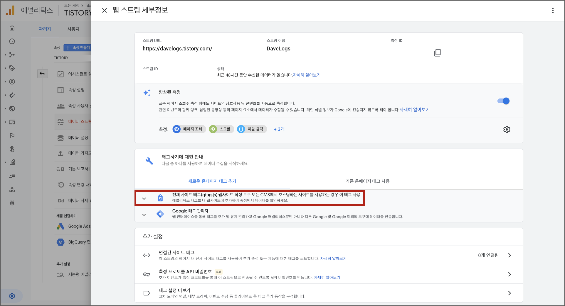 세부 정보 페이지에서 '새로운 온페이지 태그 추가 > 전체 사이트 태그(gtag.js) 웹사이트 작성 도구' 를 선택한다.