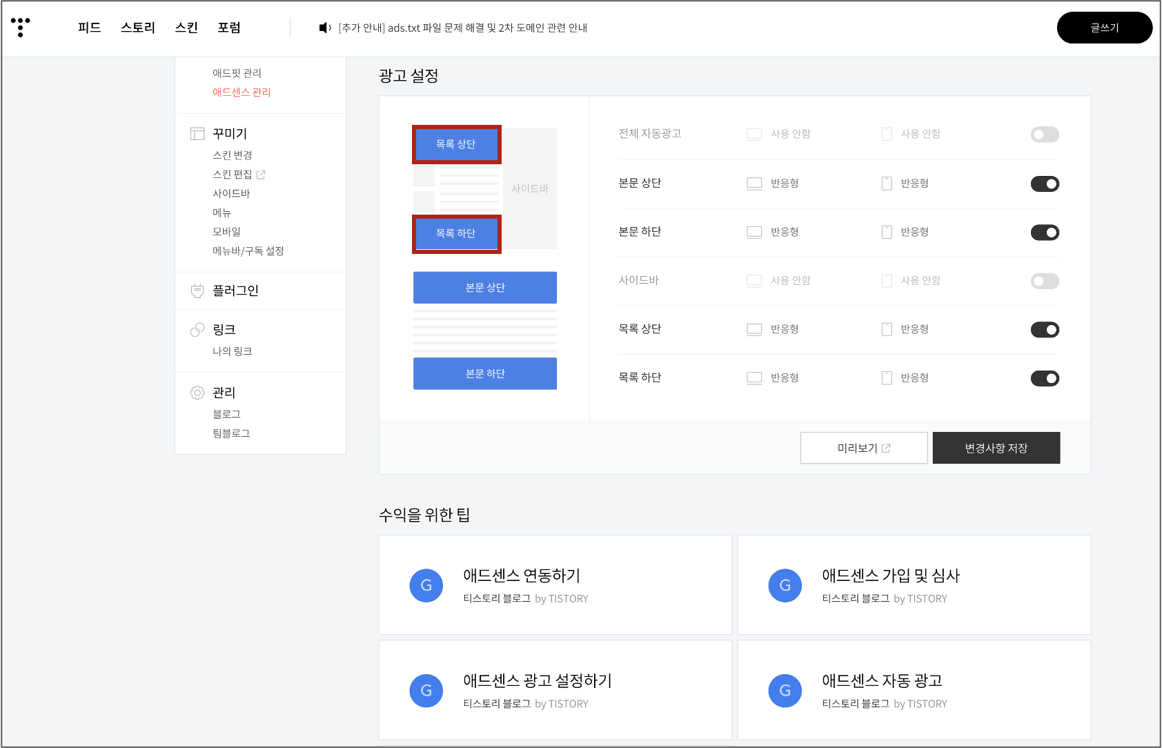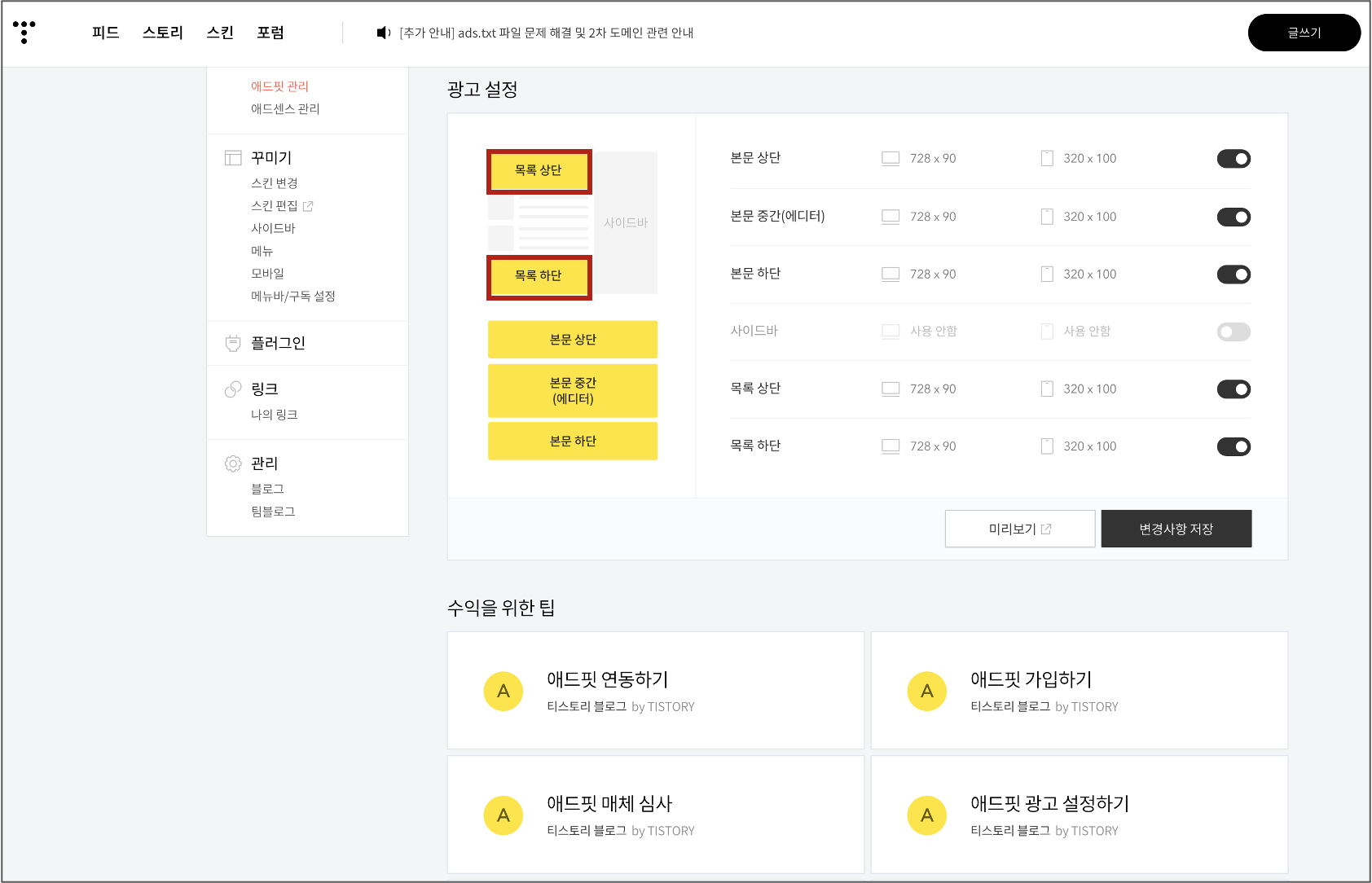 이제 다시 '블로그 관리 > 수익 > 애드핏 관리' 페이지로 이동해서 '목록 상단', '목록 하단' 영역에 광고가 삽입되도록 설정한다. 이는 구글 애드센스 (Google AdSense)와 카카오 애드핏 (kakao AdFit) 모두에 해당한다.