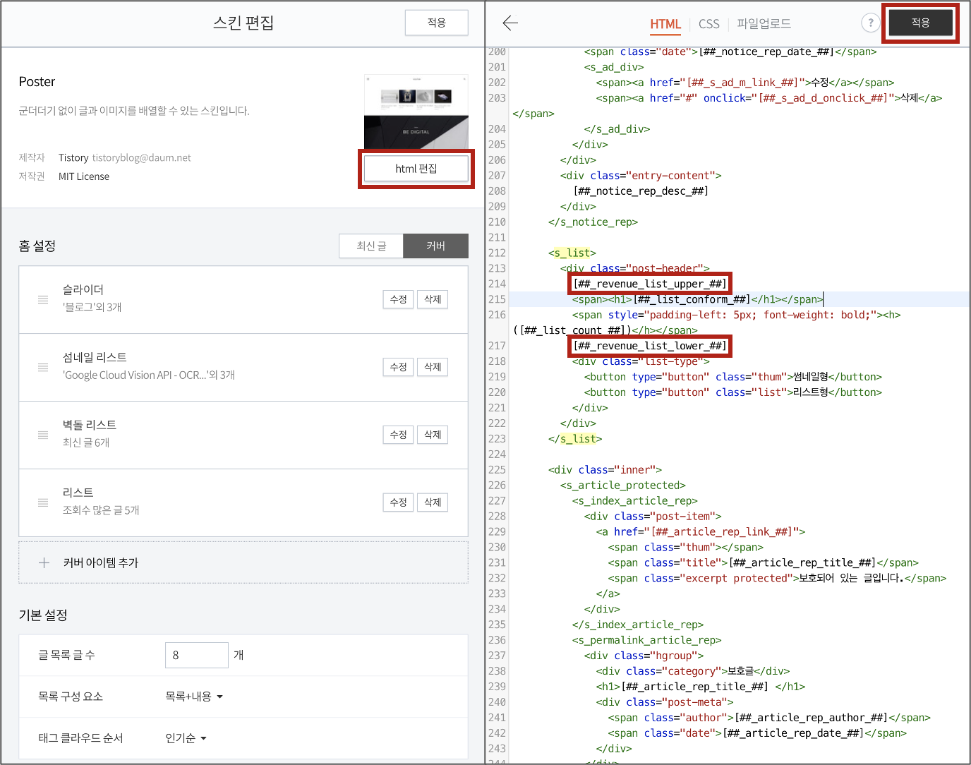 아래와 같이 <s_list></s_list> 하위에 '<span><h1></h1></span>'를 기준으로 위아래에 각각 '목록 상단 치환자'와 '목록 하단 치환자'를 삽입해 준다.