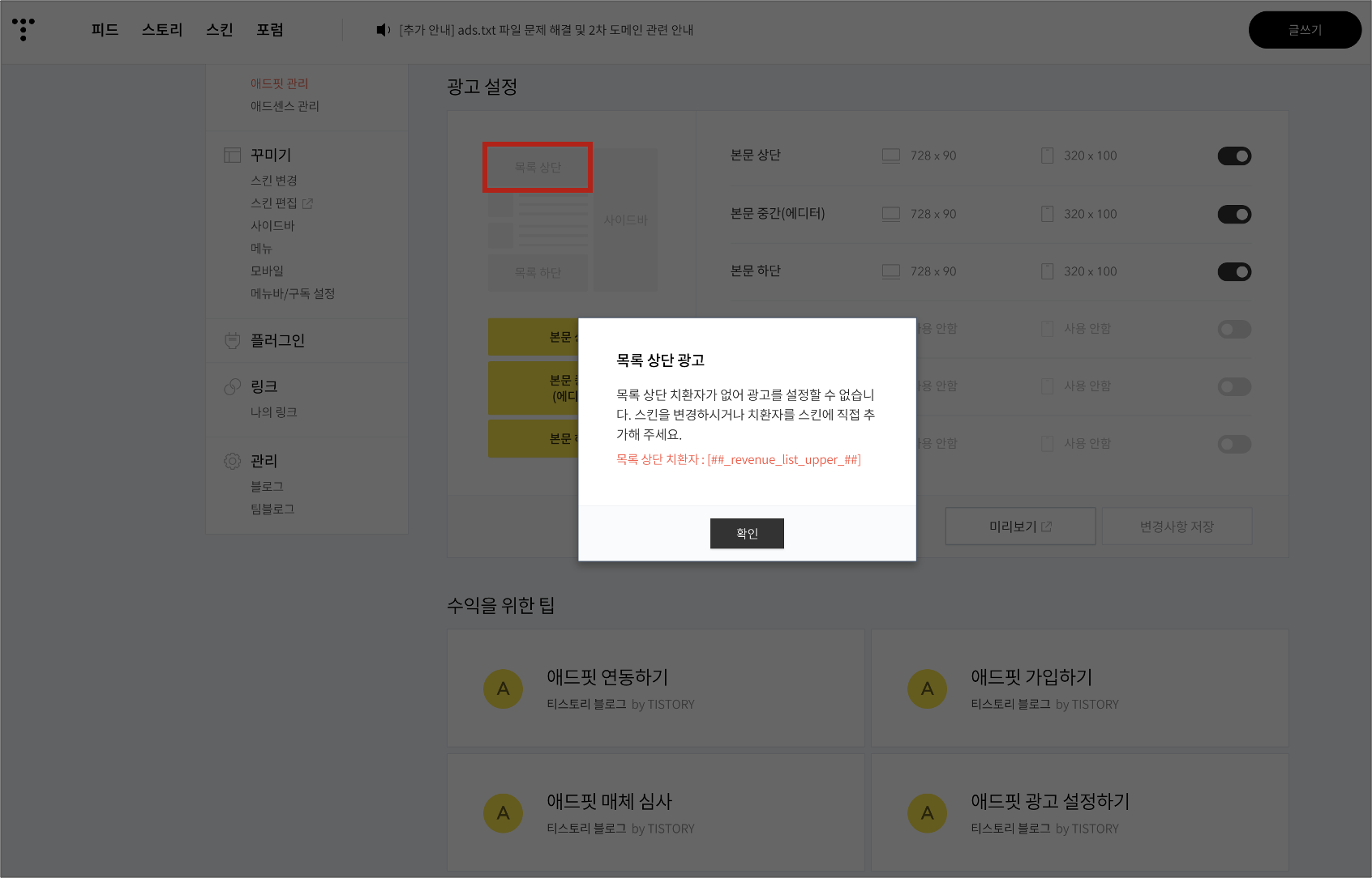 이어서, 티스토리 홈에서 커버 아이템 사이사이나 하단에 광고를 게재하는 방법을 알아보겠다.