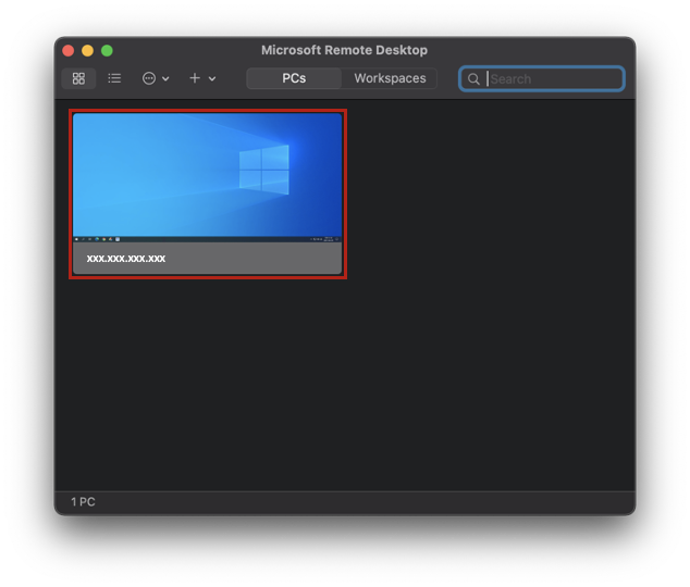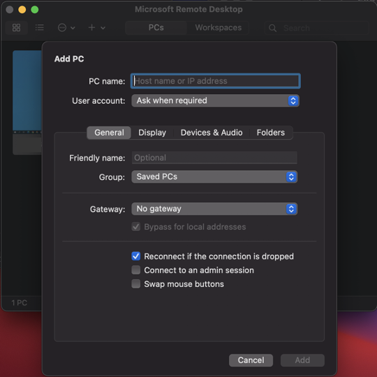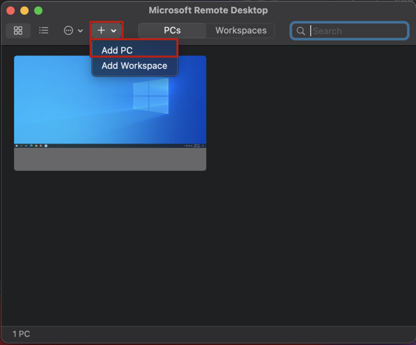'Microsoft Remote Desktop'을 실행, 다음의 화면에서 '+' > 'Add PC' 를 순차적으로 누른다.