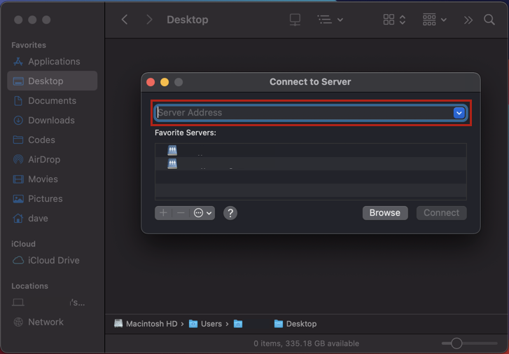 먼저 Finder를 열고, 서버 연결 단축키인 'Command + K'를 실행하면 다음과 같은 화면이 나온다.