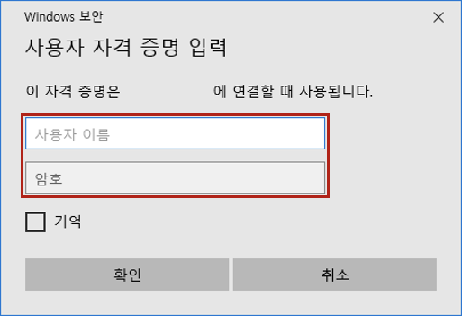 접속하고자 하는 윈도우(Windows)의 사용자 계정 정보를 입력한다.
