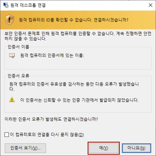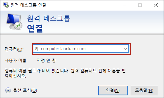 붉게 표시한 박스에 접속하고자 하는 정보를 입력하면 되는데, 내부 네트워크에 존재하는 PC에 접속하고자 한다면 PC 이름을 입력해도 되고, 외부에 존재한다면 IP를 입력하면 된다.