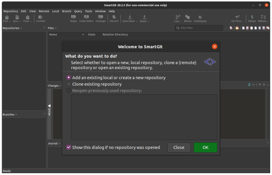 설치가 모두 끝나면 위와 같이 SmartGit 메인화면이 나오는데, 이 화면은 SmartGit에 등록된 repository가 없다면 앞으로도 자주 볼 수 있을 것이다.